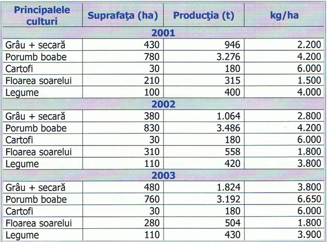 Analiza valorilor din tabelul anterior relevă, că pe lângă culturile de bază grâu, secară şi porumb, se cultivă plante tehnice precum floarea soarelui şi cartoful, care ocupă un loc important în suprafaţa cultivată a comunei.